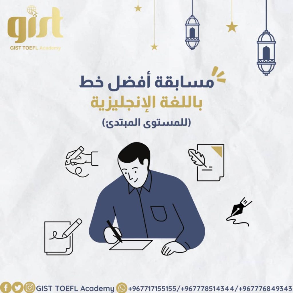 ACTIVITIES Read more CALLIGRAPHY COMPETITION THE BEST HANDWRITING / 909 / 0 Calligraphy Competition The Best Handwriting Online at GIST TOEFL Academy Lead by:T. Safaa and T. Ibrahim Objective: To help encourage students to enjoy writing more... Continue reading 26 فبراير