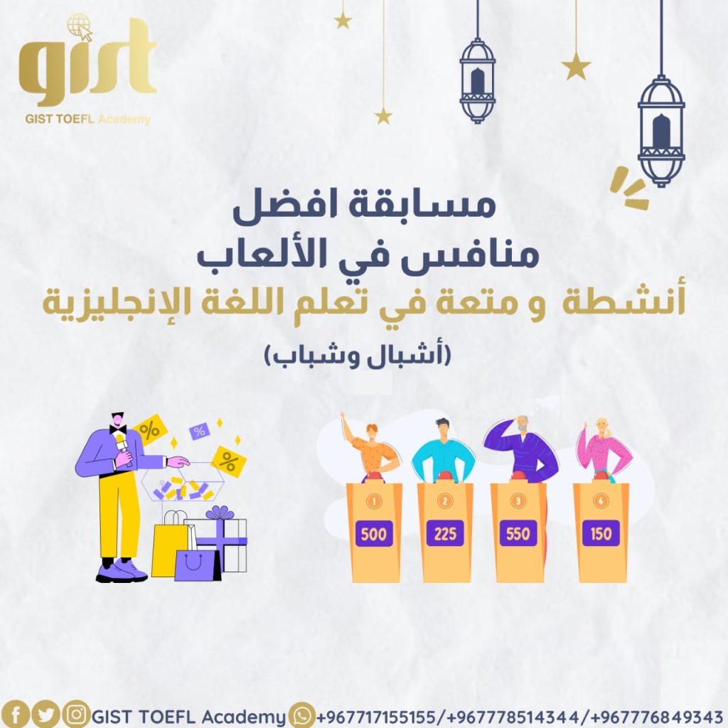 ACTIVITIES Read more BEST GAMERS IN A CLASS COMPETITION / 553 / 0 Best Gamers In a Class Competition Online at GIST TOEFL Academy Lead by T. Faten and T. Lara Levels:AA to AI / A*Mod to 1B... Continue reading 27 فبراير